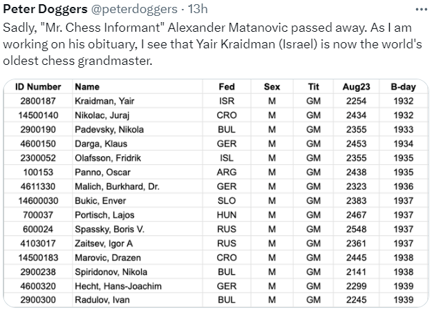 Не знаю, каким источником пользовался П.Доггерс при составлении этого списка, предполагаю, что базой ФИДЕ. Но несколько неожиданно для меня, что обычно точный Питер Доггерс данные не проверил. (Правда, это всего лишь твит, а не публикация).