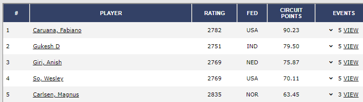 Fabiano Caruana is currently topping the FIDE Circuit leaderboard with 90.23 points, followed by Gukesh with 79.50pts, Anish Giri with 75.87pts and Wesley So with 70.11pts. | Причем о том, что Каруана уже квалифицировался из КМ и в гонке "тура" не участвует, сообщить "прямо" не озаботился, чем вызвал шквал недоуменных вопросов. |