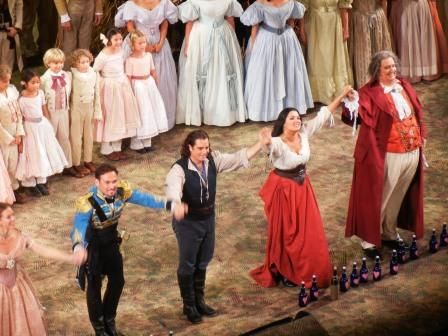 Это издержки просвещения: раньше они пели себе по-итальянски, никто слов-то и не понимал. А теперь взяли моду внизу экрана бегущей строкой английский перевод писать, все и ахнули. А я вот в субботу очередной раз ходил на "Любовный напиток" Доницетти. Интересно, как эта опера шла во время борьбы с пьянством в СССР? Вот некая фотография (не моя) ещё с тем великим составом, где были Нетребко и Квечень. В конце на сцене в ряд выставлены бутылки эликсира ("Бордо").