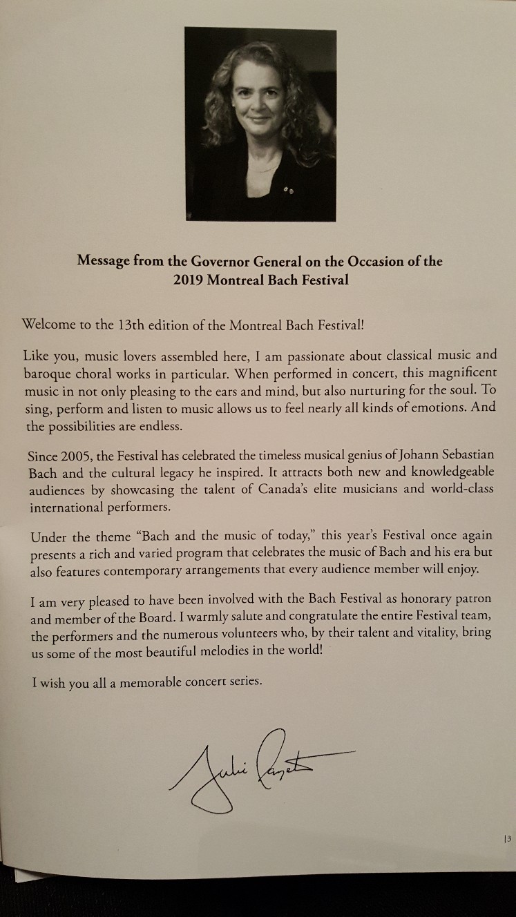 А я вчера ходил на бранденбургские концерты Баха. Я сидел на 11 ряду, а на 10 (можно было потрогать рукой) сидела дважды-летавший астронавт, и попутно вице-королева - генерал-губернатор Канады Жюли Пайетт, та самая: