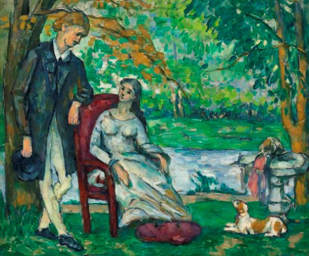 La conversation dates from the period when Cézanne was beginning to reveal the increasing influence of the Impressionism being championed by a number of his friends and fellow artists, especially his great mentor Camille Pissarro. In this work, Cézanne has moved away from the dark, bulky brushwork of his earlier pictures, which often had violent narratives that matched their moods. Instead, La conversation shows a debonair man leaning and talking to a seated woman in a garden or park, with a body of water, perhaps a river, in the background. La conversation thus can be seen in the light of some of the glimpsing visions of modern life embraced by the Impressionists, alongside whom Cézanne would exhibit in their first group show in 1874. In La conversation, there are trees, a dog and even an urn, allowing Cézanne to underscore the idyll of this scene, a marked contrast to Cézanne's own life, which had been complicated by his affair with the younger model, Hortense Fiquet. At the beginning of 1872, Hortense gave birth to their son, also called Paul, further adding to the artist's problems.