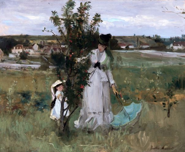 The figures depicted are Morisot’s sister, Edma Pontillon, and Edma’s daughter Jeanne. They are shown playing hide-and-seek in the landscape surrounding the country estate of Edma’s father-in-law in the village of Maurecourt, not far from Paris.
