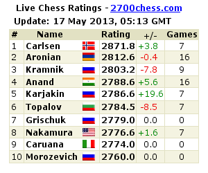 Кстати, если Крамник проиграет завтра (не думаю), то его LiveRating будет абсолютно идентичен с LiveRating Топалова = 2793,3 |