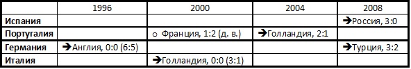 sargis: Информация к размышлению: Приведена история выступлений команд в четвертфиналах на предыдущих 4-х чемпионатах, начиная с 1996 года. Каждый может делать свой вывод/предсказание. Мое предсказание - Англия - Италия 0:0, основное и доп. время.