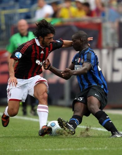 Любопытно, что в стартовом составе Интера не было ни одного итальянца. Было несколько аргентинцев с итальянскими конями – Дзанетти (36-летний капитан провёл выдающийся матч), Камбиассо, Диего Милито (его брат Габриэль выступает за Барсу). По ходу матча было сделано 3 замены – сначала вышли Киву и Станкович и наконец вместо получившего небольшую травму Милито на игру вышел единственный игрок с итальянским паспортом, итльянским именем и итальянской фамилией Марио Балотелли. Он на фото справа. )