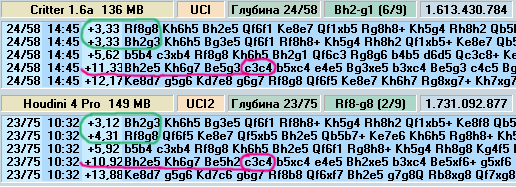 Как видно, Critter 1.6a и Houdini 4 (в тактическом режиме), ставят Be5 (после Kh6) только на 4 позицию, т.к. видят весь ужасный "ужасный конец" после c4, предпочитая ему не такой ужасный "ужас без конца" - Bg3 и Rg8, и даже b4 лучше
