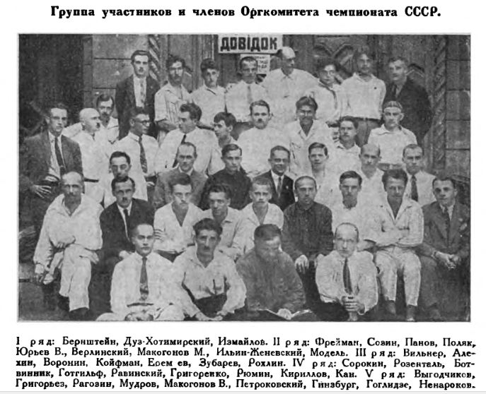 С. Ткаченко: " Подсказываю: "лысенький в стеклышках" это Петр Измайлов. Рядом - Дуз. Первый слева - московский первокатегорник Александр Бернштейн. Кто второй слева?"