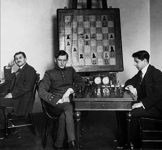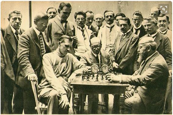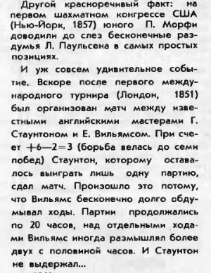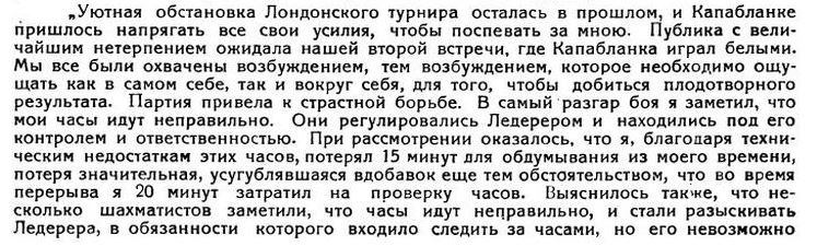 ...спорт— составная часть нашей игры, однако низведение его до минимального значения не только возможно, но и настоятельно необходимо. Если бы, действительно, вообразить себе такую «переоценку ценностей»,—которая, конечно, внезапно произойти не может, но может явиться следствием постепенной эволюции психики шахматистов,—что в партии значение имеет не внешний выигрыш или проигрыш, а внутреннее творческое напряжете, глубина мысли, сложность расчета; если бы, далее, турнирные результаты определялись не количеством единиц, но блеском комбинаций и силой дарования, если бы, наконец, вместо формальных «королей» стала равная республика, президент которой, если он нужен, был бы только в мыслях составляющих ее граждан,—если бы, словом, из области внешней оценки мы пришли бы к внутренней, так и единственно соответствующей искусству,—тогда, мы уверены, многие теперешние затруднения были бы обойдены .