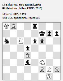 Вот! Когда я задавал вопрос, то думал про то, что, возможно есть какая-то партия между ними, которой нет в базах и кто-то про эту партию в курсе. И эта версия подтверждается Вашей ссылкой на результаты турнира, согласно которой Балашов таки выиграл у Матуловича. Но была ли она отложена в такой позиции как указал Малкин - большой вопрос. Скажите, а самой партии, случайно, нет у Вас? Был бы очень признателен. Перерыл все базы - не нашел