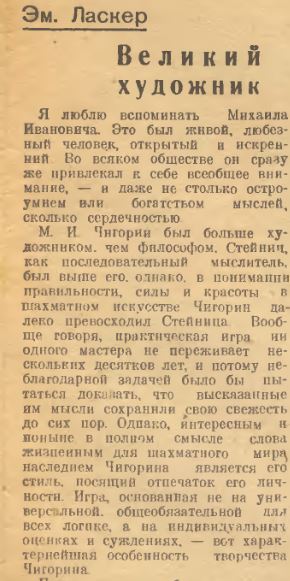 "Современное развитие шахматной игры не благоприятствует вольному полету фантазии; оно не вознаграждает, а разочаровывает, так как, в конце концов, работа фантазии становится бесцельной. Разумеется, можно играть лучше противника, но этого еще недостаточно для выигрыша Логический исход партии часто бывает ничейным, несмотря на то, что один из противников явно переиграл другого. Достигнутое в игре преимущество часто слишком ничтожно и тонко и, брошенное на оценочную шкалу игры, просеивается, словно мелкий песок сквозь грубое решето. Незначительное преимущество недостаточно для устранения возможности пата, и в результате, становится трудным сделать партию хотя бы немного интересной"