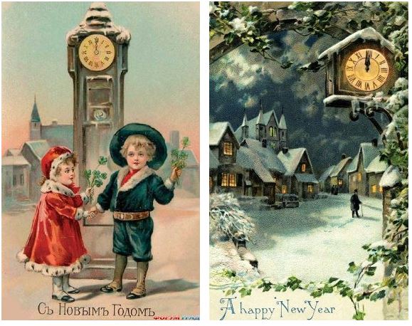 | Часы — один из самых распространенных элементов новогодних открыток, как дореволюционны, так и советских. Их полуночный бой в новогоднюю ночь связывался с ожиданием счастья и перемен к лучшему. На советских открытках стали изображаться не просто часы, а часы со Спасской башни Кремля, ставшей символом советской власти. Эта ассоциативная связь начала складываться в 30−40-е годы. |