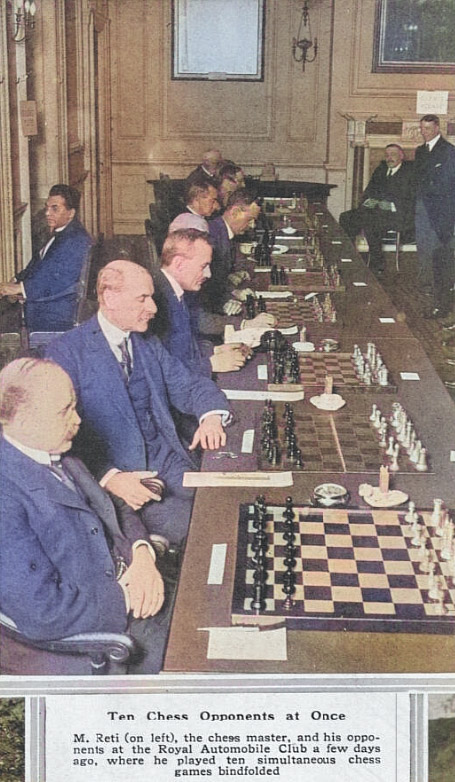 | 100 лет назад: Рихард Рети проводит сеанс одновременной игры с завязанными глазами в RAC, Пэлл-Мэлл, Лондон, 24 января 1923 года. (Он набрал +6, = 4) |