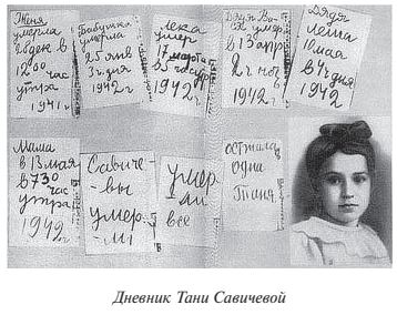 Многие ленинградцы помнят имя блокадной девочки Тани Савичевой. В дни блокады она вела дневник , в 1944 г. умерла. В дневнике было 9 страничек, и на каждой по одному предложению: