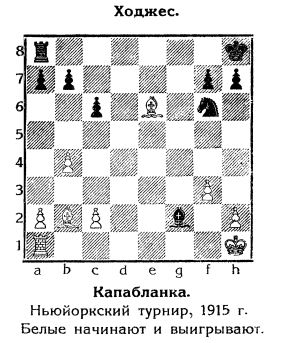 | Движки, как обычно, приводят в уныние: первый ход Капабланки был идейным, но не самым сильным, а ответ Ходжеса - просто грубой ошибкой. После следующего хода белых он сдался. |