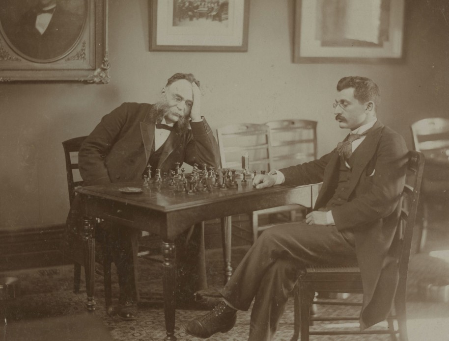 Эмануэль Ласкер (слева) - претендент на звание чемпиона мира по шахматам. Ласкер вошел в матч на пике формы, выиграв турнир в Нью-Йорке в 1893 году с поразительным результатом 13/13.