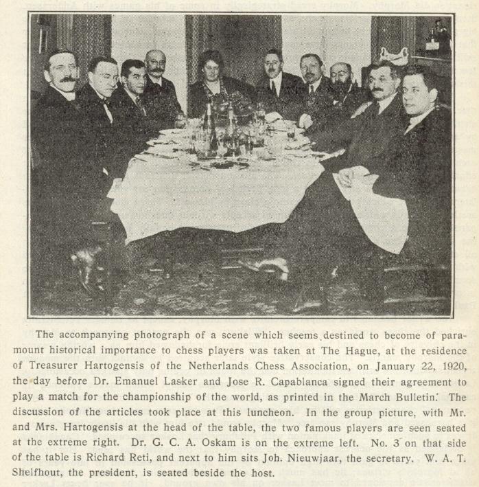 Сопровождающая фотография сцены, которой, по всей видимости, суждено приобрести первостепенное историческое значение для шахматистов, была сделана в Гааге, в резиденции казначея Нидерландского шахматного союза господина Хартогенсиса, 22 января 1920 года — за день до того, как доктор Эмануил Ласкер и Хосе Р. Капабланка подписали соглашение о проведении матча за звание чемпиона мира, о чём сообщалось в мартовском бюллетене. Обсуждение статей соглашения состоялось за этим обедом.