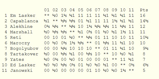 В числе участников были д-р Эмануил Ласкер, Капабланка, Алехин, Маршалл, Яновский, Мароци, Боголюбов, Рети, Тартаковер, Эдвард Ласкер и Йейтс. Контроль времени составлял 30 ходов за два часа и затем по 15 ходов в час. Ожидалось, что победу одержит действующий чемпион мира Капабланка, однако 55-летний д-р Ласкер доказал, что он отнюдь не исчерпал свои силы, и уверенно выиграл турнир.