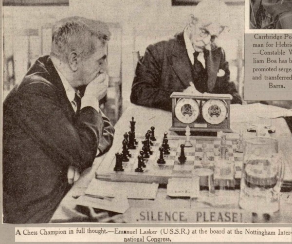 | Шахматный чемпион в полной сосредоточенности — Эмануил Ласкер (СССР) за доской на Международном конгрессе в Ноттингеме. |