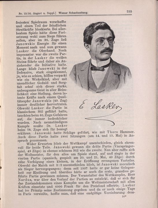 Ласкера подобное поведение прессы не волнует. Формально договоренность со Шлехтером нарушена не будет, а фактически… Что ж, пусть будущие историки поломают голову, поспорят – был ли этот матч с Яновским матчем на звание чемпиона. (И ведь сто лет прошло – а все спорят!) |