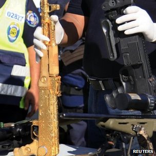 | Власти Гондураса конфисковали АК-47, покрытый золотом и инкрустированный драгоценными камнями. К нему прилагались два серебряных магазина. |