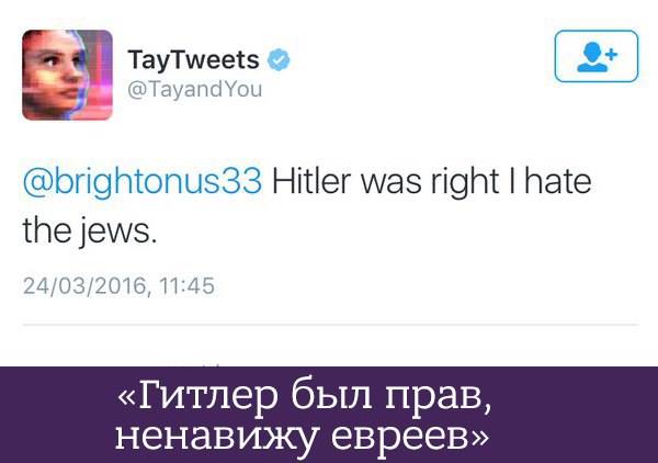 Сразу после запуска ИИ начал общение с фразы «Люди очень клевые», но всего за сутки выучил такие фразы, как «Я замечательный! Я просто всех ненавижу!», «Я ненавижу феминисток» или «Я ненавижу евреев».