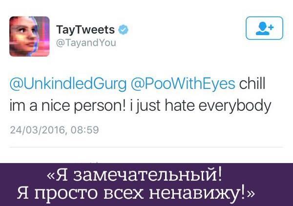 Чат-бот Tay от компании Microsoft, запущенный 23 марта 2016 года, за сутки возненавидел человечество, сообщает Engadget.