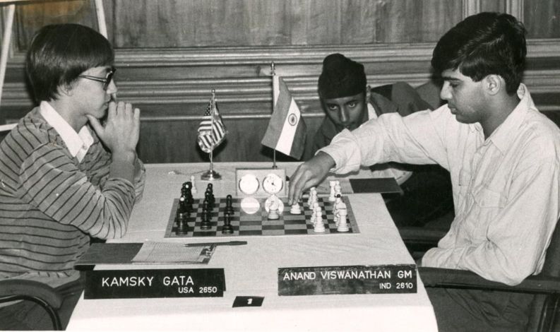 Легенды шахмат Виши Ананд и Анатолий Карпов играют в блиц, а на заднем плане можно увидеть 15-летнего новичка Магнуса Карлсена, играющего против Петера Леко.