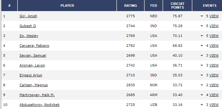 тьфу-ты, я не лучше, чем ФИДЕ. эти 14 очков целиком может получить только Каруана - у него лишь 4 турнира в активе. Остальные добавят к свой сумме разницу с худшим из пяти результатов. Гири - около 12 очков, Со - всего около 5-ти, Гукеш - совсем копейки.