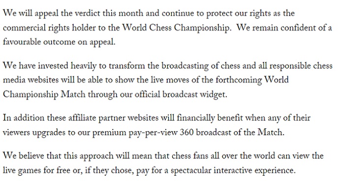 Сильно. По ссылке там много чего. Например, "information about the chess moves is not a trade secret and is not protected by law". Комментарий чесс24: "Put simply, you can no more stop people reporting a Magnus Carlsen move than a Lionel Messi goal". Интересно, как это скажется на матче.