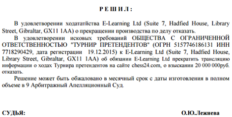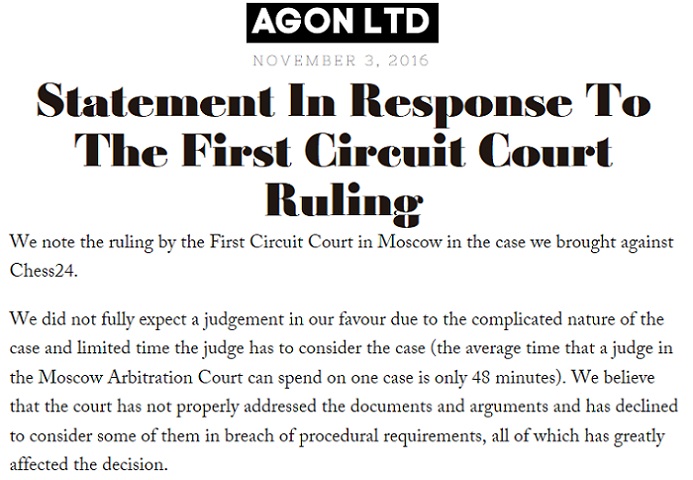 Дело против chess24.com в Московском арбитражном суде Агон проиграл