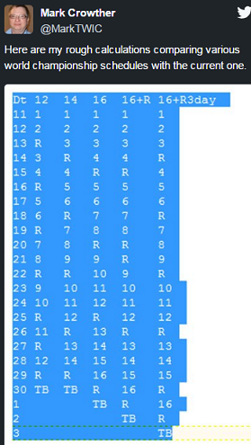Почитатель: Матч из 16 партий может быть проведен практически в те же сроки, что и матч из 12 партий. С необходимым (и достаточным) числом выходных дней.