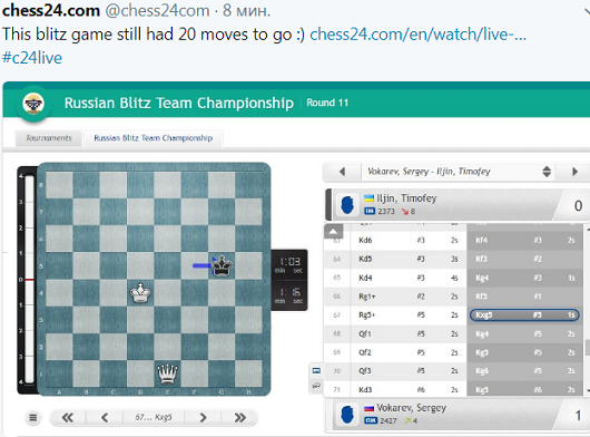 Вот ярчайший пример: вторая партия финала Кубка Мира Дин - Аронян. Думаю, ты согласишься с тем, что даже при шестичасовом контроле качество разыгрывания этого эндшпиля обоими соперниками было бы несравнимо выше. А "на секундах" неизбежно имеем то, что имеем.