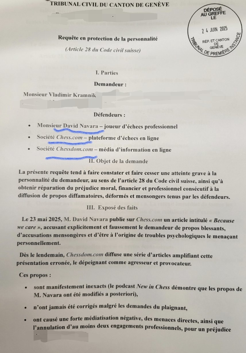 «Гражданский иск о клевете против @chesscom, @chessdom и лично г-на Навары зарегистрирован сегодня в Трибунале Женевы.