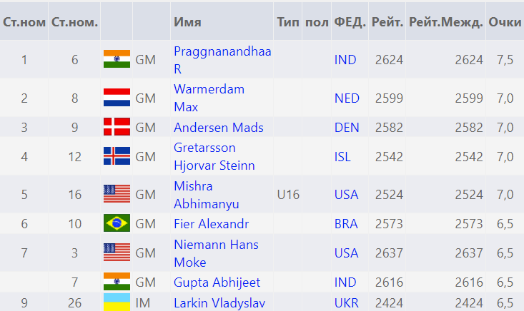 Завершился турнир "Kvika Reykjavik Open 2022".Итоговое положение после 9 туров
