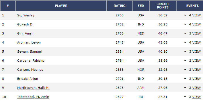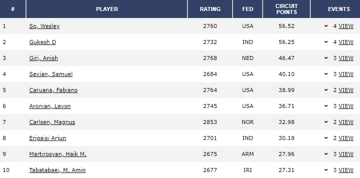 Вот как выглядит лидирующая десятка ФИДЕ-тура сейчас: