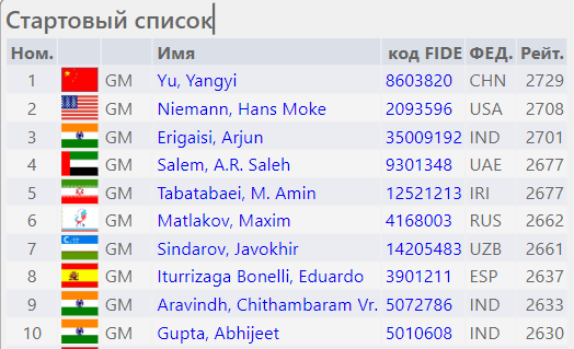 1.Фирузджа, 2.Непо, 3.Накамура, 4.Гири, 5.Ананд, 6.Раппорт, 7.Раджабов, 8.МВЛ, 9.Аронян, 10.Шах,