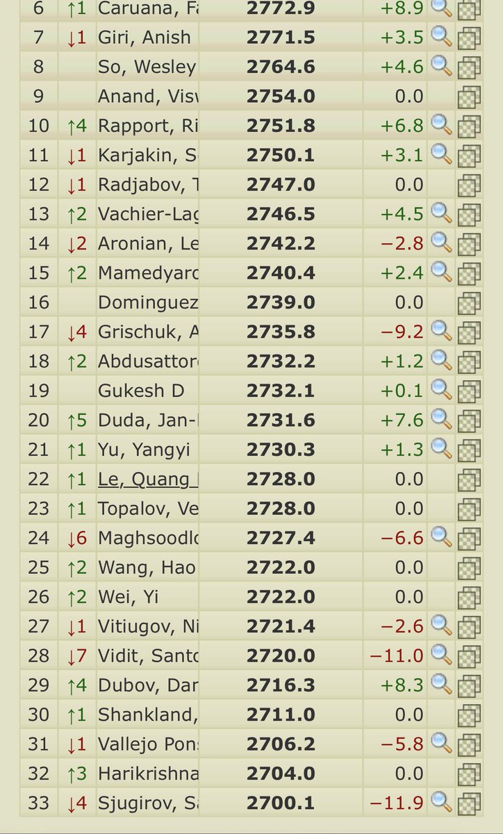 это я маху дал - не на тот кэффициент силы турнира помножил. Не около 9-ти, а около 13-ти. В результате Со и Гукеш идут теперь голова в голову, их разделяет четверть зачетного очка!
