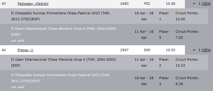 Если бы кто следил за гонкой ФИДЕ-тура более или менее внимательно (таковых, конечно, нет), он мог бы обнаружить (самостоятельно), что в какой-то момент кто-то в ФИДЕ "мышь словил": у Федосеева и Пранава (о которых я писал) по одному из двух турниров в Испании отнято. Оформлено это "без лишних слов" - незасчитанный турнир помечен цветом и добавлено: "not valid". Вот так