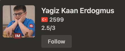 | Поздравляем 13-летнего Ягиза Каана Эрдогмуса с тем, что он стал самым молодым игроком, когда-либо преодолевшим отметку 2600 (по текущему рейтингу) после его победы на Abu Dhabi Masters сегодня! |