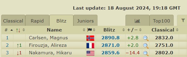 | The Top 20 after the FIDE World Blitz Team Championship: Carlsen at one point was close to 2900, but after scoring 8/8, he "only" managed 1.5/3 in his last three games. (Nakamura has an inactive blitz rating of 2874) |