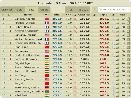 | Топ-20 после командного чемпионата мира ФИДЕ по блицу: |