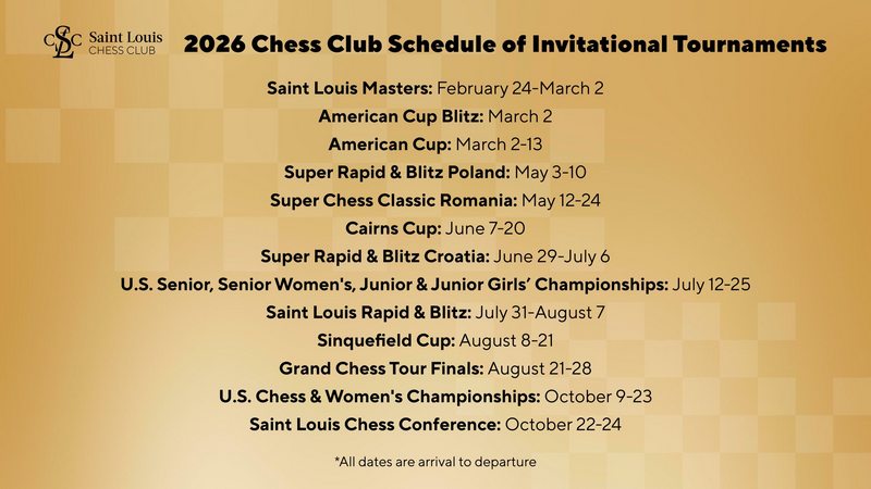 Сегодня шахматный клуб Сент-Луиса объявил о долгожданном расписании турниров на 2026 год, подтвердив свою ведущую роль шахматной столицы.