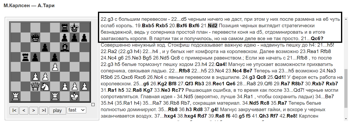 Любопытный момент из обзора о вчерашней партии Мага. После 21.Kd2, Адам пишет: