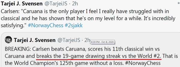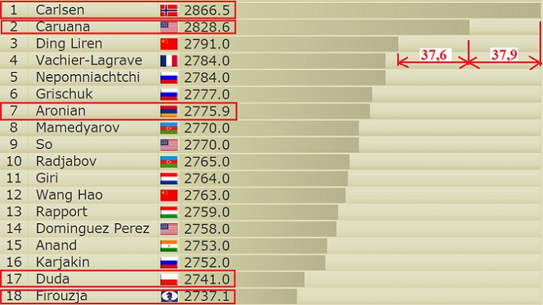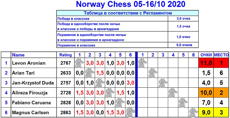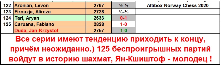 Jacob08:07-10-2020 В единоборстве прямых конкурентов №1/№2 действует фактор удвоенного эффекта - разыгрывается как бы 10 ЭЛО. На сегодня в лайве отрыв Магнуса от Фаби округлённо составляет 29 ЭЛО. В случае победы норвежца отрыв возрастёт до 38, а если победит американец, то отрыв сократится до 18 ЭЛО.