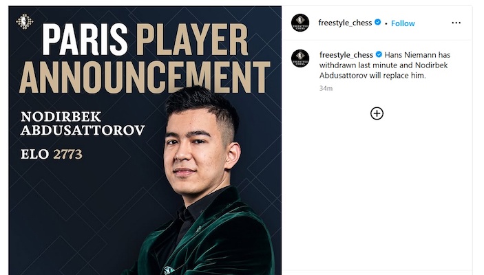 | Руководство Freestyle Chess подтвердило телеканалу TV 2, что Ханс Ниман снялся с турнира в Париже. |