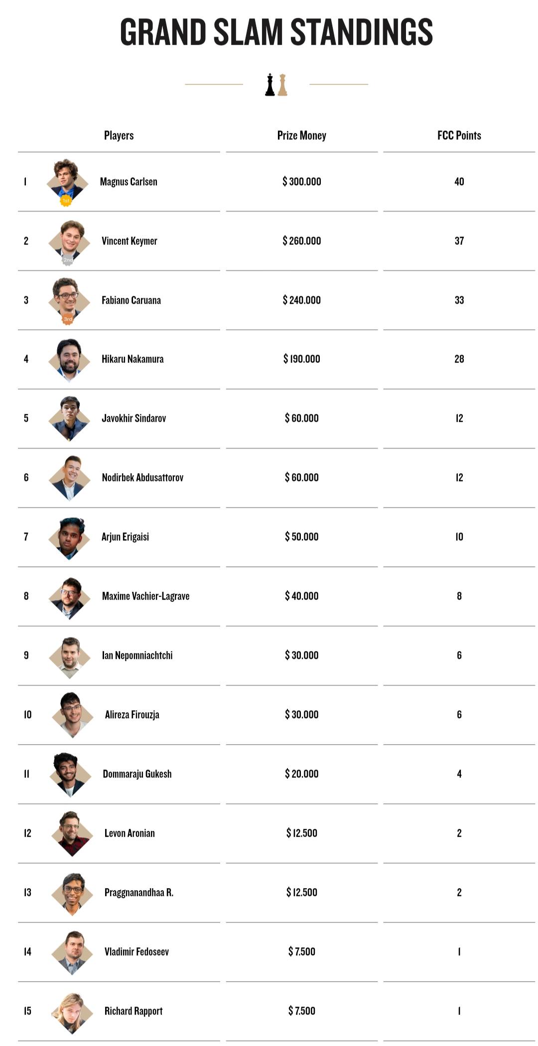 Карлсен лидирует в общем зачёте Grand Slam Tour с 40 очками, за ним идут Каймер (37 очков) и Каруана (33 очка).