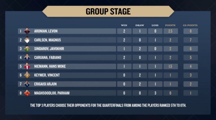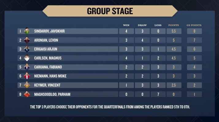 Круговой этап Финала Гранд-слэма по фристайл-шахматам завершился в понедельник в Грутбосе, и Джавохир Синдаров возглавил таблицу в день своего 20-летия. Узбекский гроссмейстер набрал 5,5 очков из 7 партий, за ним следовал Левон Аронян с 5 очками, а Арджун Эригайси и Магнус Карлсен набрали по 4,5. Согласно правилам Гранд-слэма, все восемь игроков выходят в плей-офф, а первые три получают право выбрать соперников по четвертьфиналу из нижней четвёрки.