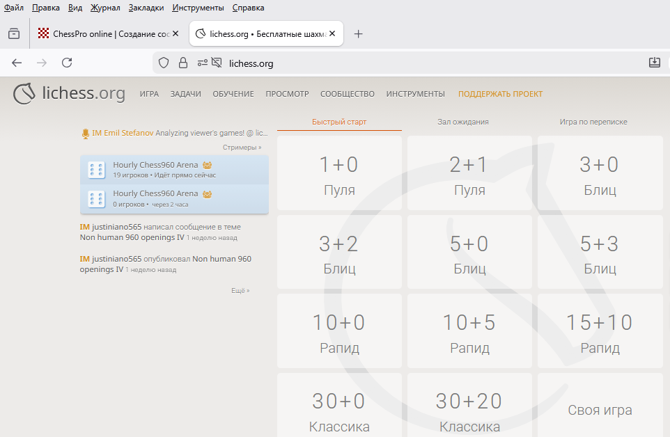 Кстати, про ШФ на личессе - ну опять же, очевидное враньё. Я ведь в них там играл. Какое там отсутствие быстрого пейринга? Всё там прекрасно есть, разумеется. Кликай себе на 3+2 игру и жди, пока примут. Другой вопрос, что игроков полтора инвалида, но в целом никаких проблем играть в ШФ там нет, как нет играть и в крейзихаус и в что-нибудь подобного уровня популярности, врать-то не надо.