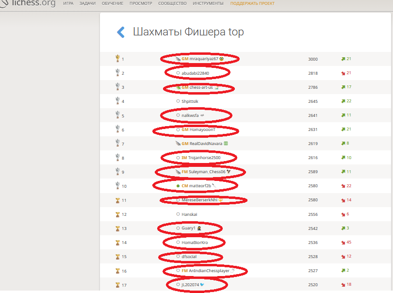 А как насчёт личессовского рейтинга, который отбивает всякую охоту там играть в шахматы Фишера, поскольку первые строчки оккупировали набившие рейтинг с контролем 30 секунд (1/2 + 0) на партию (обведены красным)?