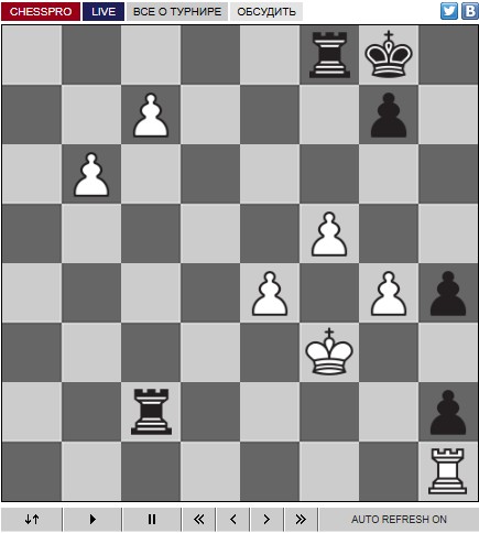 В этот момент я не мог сдвинуть короля из-за ладьи d8, но понял, что у меня есть ход ладьёй c2, а пешка спешит вперёд. У меня были две изолированные пешки — сначала b, а потом h. Наверное, только я мог представить, что всё так удачно сложится. Это было невероятно удачно, но контроль времени был беспощаден, и он рухнул.